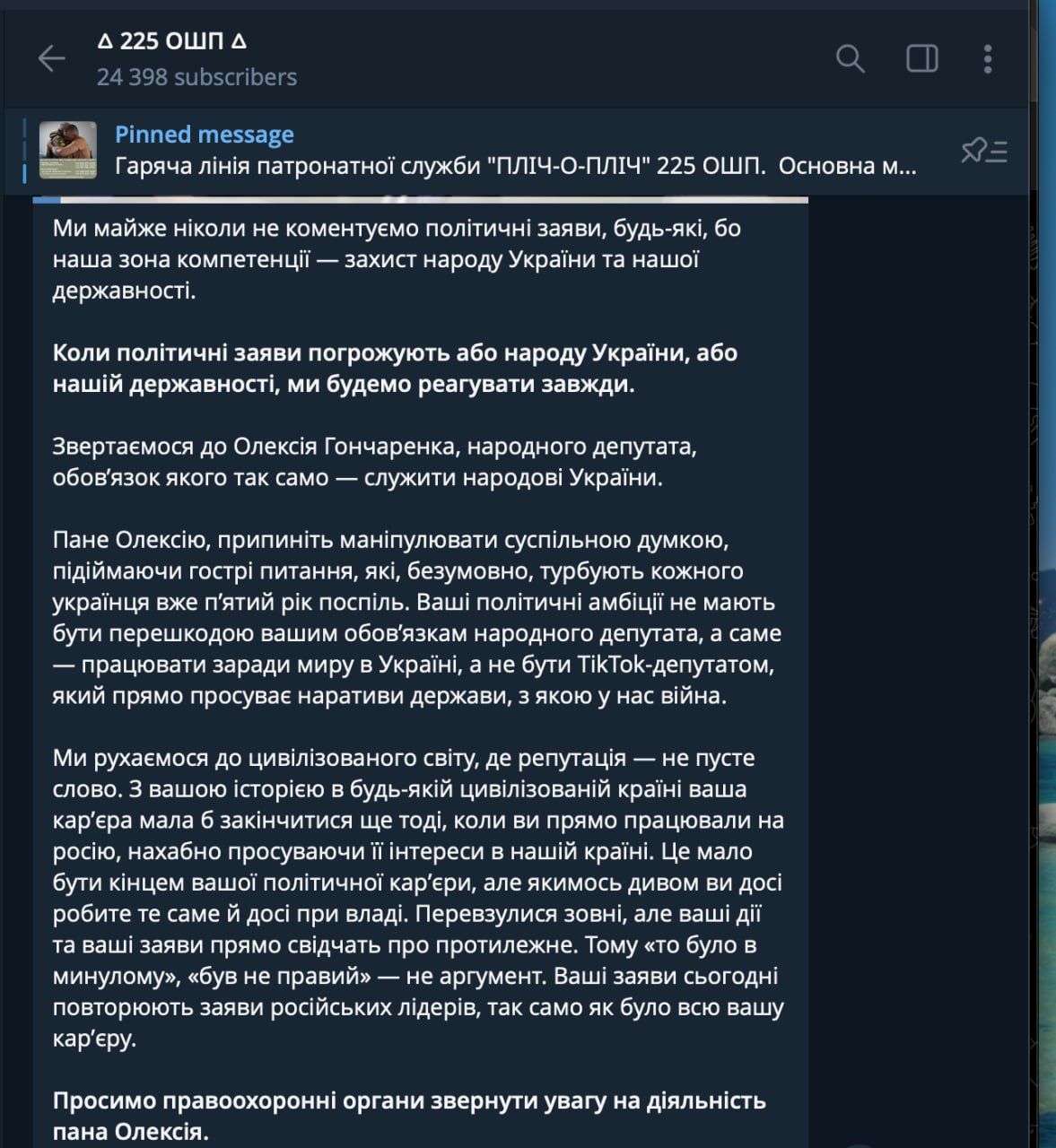 225-й окремий штурмовий полк закликав правоохоронні органи звернути увагу на діяльність народного депутата Олексія Гончаренка. Відповідне звернення оприлюднили у публічному повідомленні підрозділу.